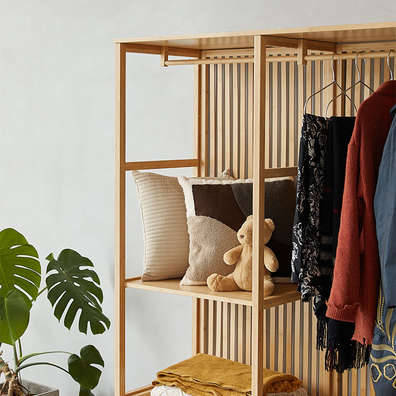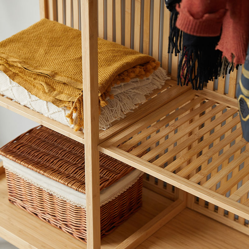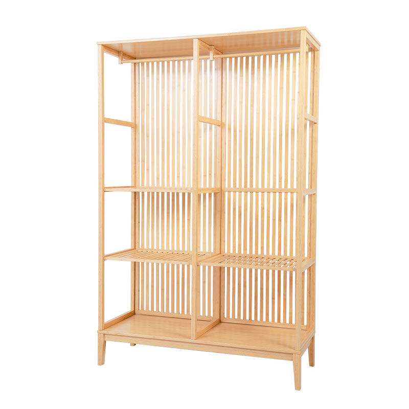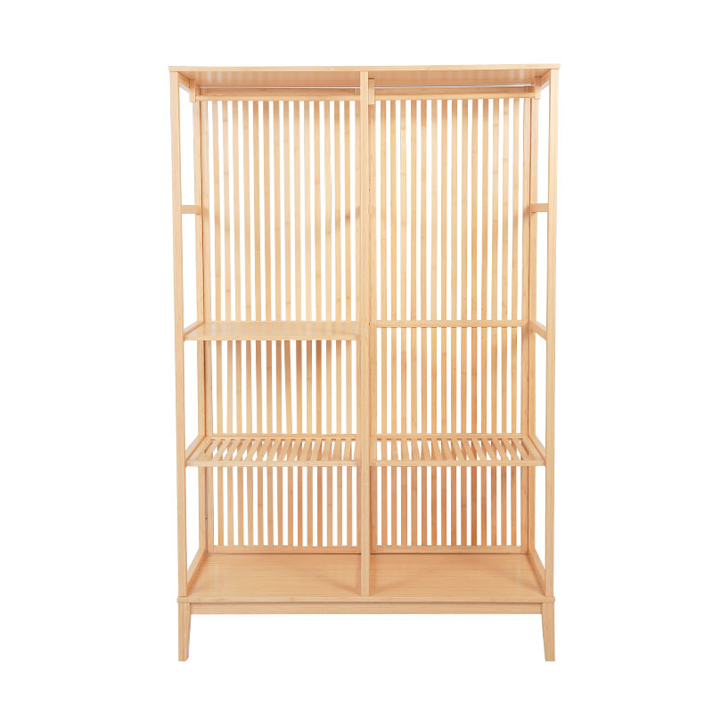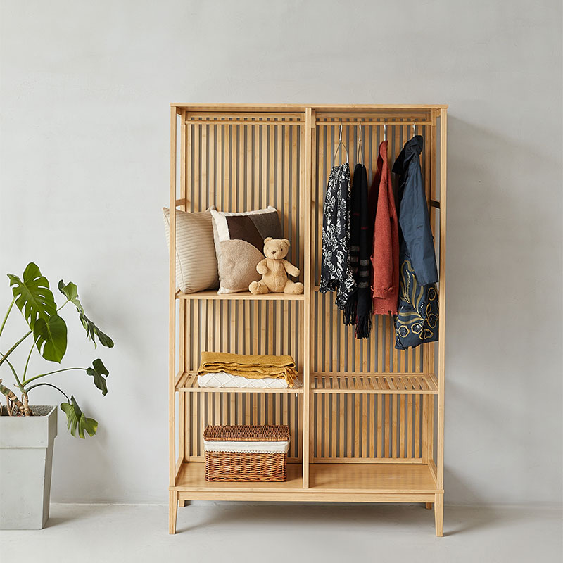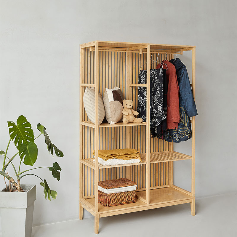 開(kāi)放式衣柜采用100%天然竹材,硬度高,經(jīng)久耐用。線(xiàn)條簡(jiǎn)約,具有獨(dú)特東方風(fēng)情。開(kāi)放設(shè)計(jì),空間通透,一側(cè)設(shè)有固定壁柜,另一側(cè)設(shè)有滑門(mén),雖為開(kāi)放式,但也保證足夠的隱私??蓪⒁鹿褫^短的一側(cè)固定在墻上,作為房間隔斷,收納空間強(qiáng)大,滿(mǎn)足放置日常衣物的需求。